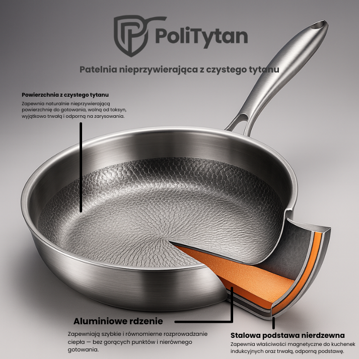 Twoja kuchnia zasługuje na odświeżenie naczyń, które przetrwają próbę czasu. PoliTytan® oferuje gotowanie bez chemikaliów, trwałe i wszechstronne — idealne dla codziennych kucharzy.